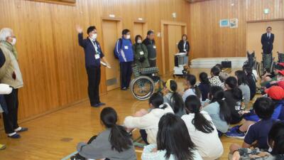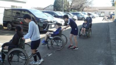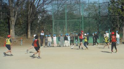ãæ°åº§äžåŠæ ¡ã®çåŸãããããã€éåã®ããé£å±å°ã«æ¥ãŠãããŸãããããã¯ããããããŸããæ°åº§äžåŠæ ¡ã§ããããšãå°åŠçã«æãã声ããããŠãããŸãããå¶æå§¿ã®äžåŠçã¯ãšãŠãç«æŽŸã§ãå°åŠçã¯å°ãç·åŒµããªãããããã€ã亀ãããŠããŸãããæ°åº§äžåŠæ ¡ã®ã¿ãªãããæ©æããããããšãããããŸããã