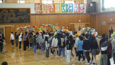 ããããã忥ããŠããïŒå¹Žçã«åšæ ¡çãæè¬ã®æ°æã¡ãäŒãããïŒå¹ŽçãéãäŒããè¡ãããŸãããååŠå¹Žã®å·¥å€«ãåãããåºãç©ã«ãäŒå Žã¯å€§çæ³ã§ãããïŒå¹Žçãããããç€Œã®æ°æã¡ã蟌ããŠåå¥ãæ«é²ãããæ²ã«åãããŠèªç¶ã«ææåãçãŸããŸãããæ¬åœã«æ¥œãããæãåºã«æ®ãäŒã«ãªããŸããã