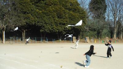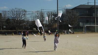 1年生が、自分で作った凧でたこあげをしていました。糸巻を持って走ると、風を受けて凧が揚がっていきます。一生懸命走るので、自分の凧がどのくらい揚がっているのかなかなか見られないのですが、「あがった、あがった!」と、とても楽しそうにしていました。